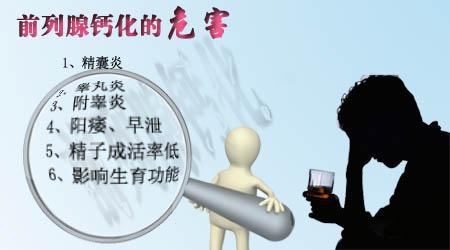 中期:前列腺结石中期表现为前列腺钙化,前列腺钙化灶上易滋生细菌,对于青壮年患者来说,又是前列腺炎反复发作的一个因素,不容忽视。钙化灶会发展成结石,可加重前列腺的炎症。但前列腺钙化灶不能完全消失,慢性前列腺炎时会造成精子的成活率降低,精液液化时间延长,致使受孕率降低,影响生育。